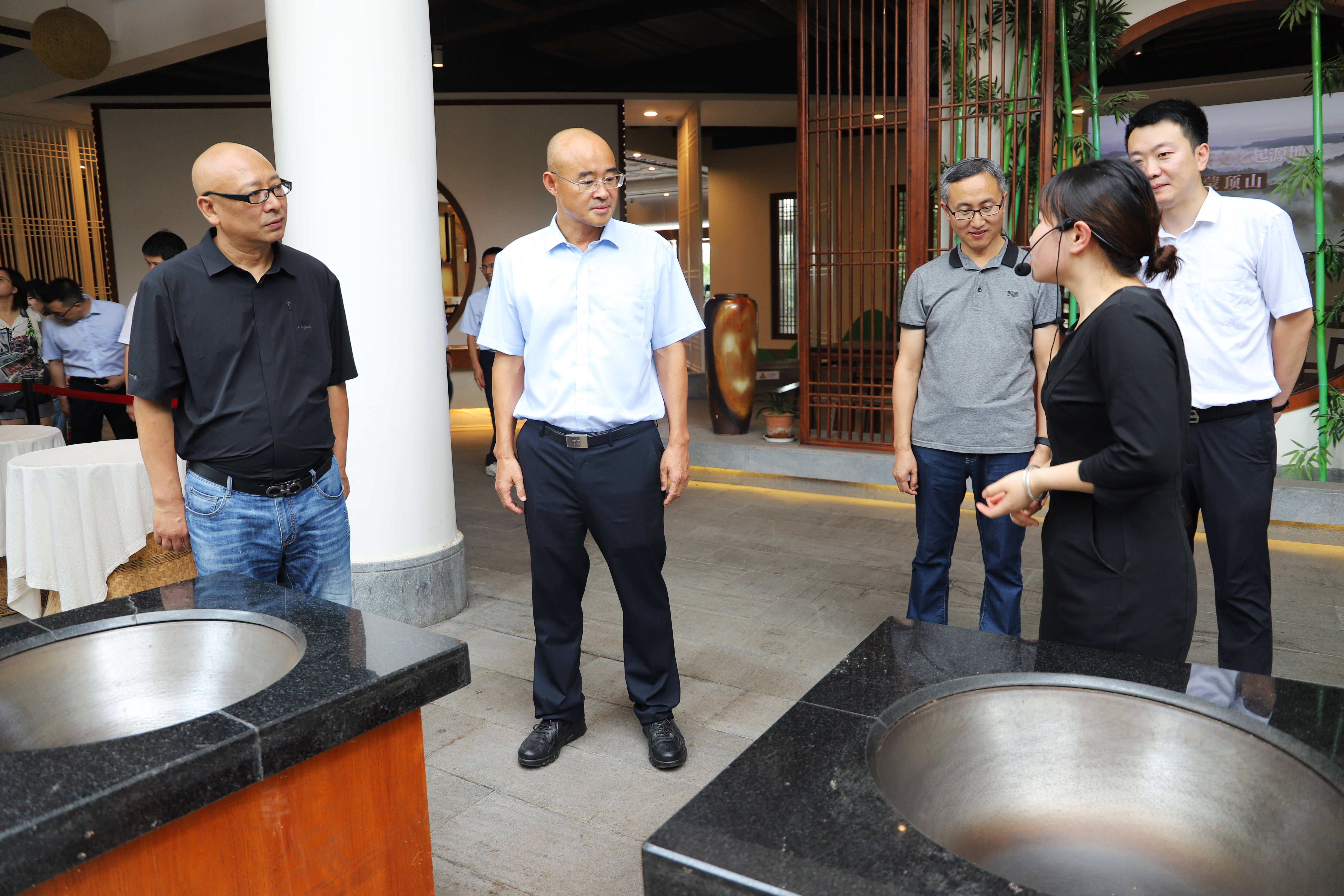 調(diào)研組參觀了市擔(dān)保公司在保企業(yè)——四川蒙頂山躍華茶業(yè)集團(tuán)有限公司,從茶園到茶杯,從采摘到成品,調(diào)研組對(duì)雅茶的制作和品鑒有了全面深入的了解。在隨后的座談中,參會(huì)人員集中學(xué)習(xí)了《關(guān)于加強(qiáng)政府性融資擔(dān)保機(jī)構(gòu)管理工作的通知》(川財(cái)金〔2023〕45號(hào)),共同探討了創(chuàng)設(shè)和推廣“蜀擔(dān)快貸—興雅貸”銀擔(dān)批量產(chǎn)品的相關(guān)事宜。
